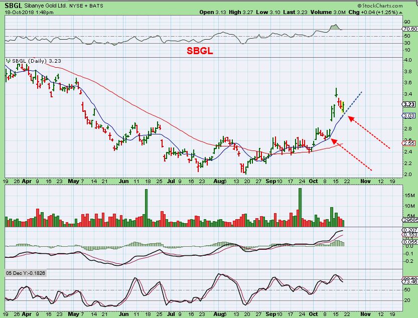 SBGL  OCT 18th –  It bounced along that 50sma , but has still moved from $2.40 to over $3.40 and is now pulling back again for another entry.