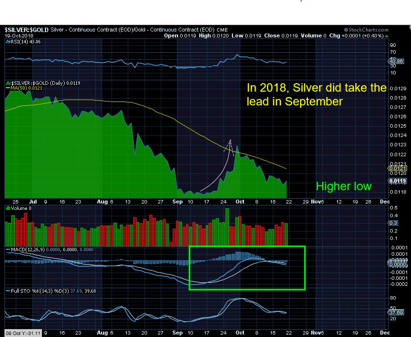 SILVER : GOLD NOW –  And plus I already pointed out in a prior report-  even with Silver near the lows, it was leading gold at the end of September and still shows a higher low.