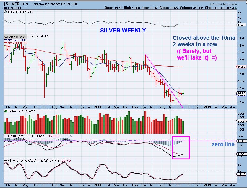 SILVER WEEKLY  – Silver has closed above the weekly 10 ma, it has broken the downtrend line, and also look at how oversold Silver still is on a weekly basis.  The MACD is close to crossing upward and the histogram is at the zero line. When it plays catch up,  Silver often BURSTS higher.