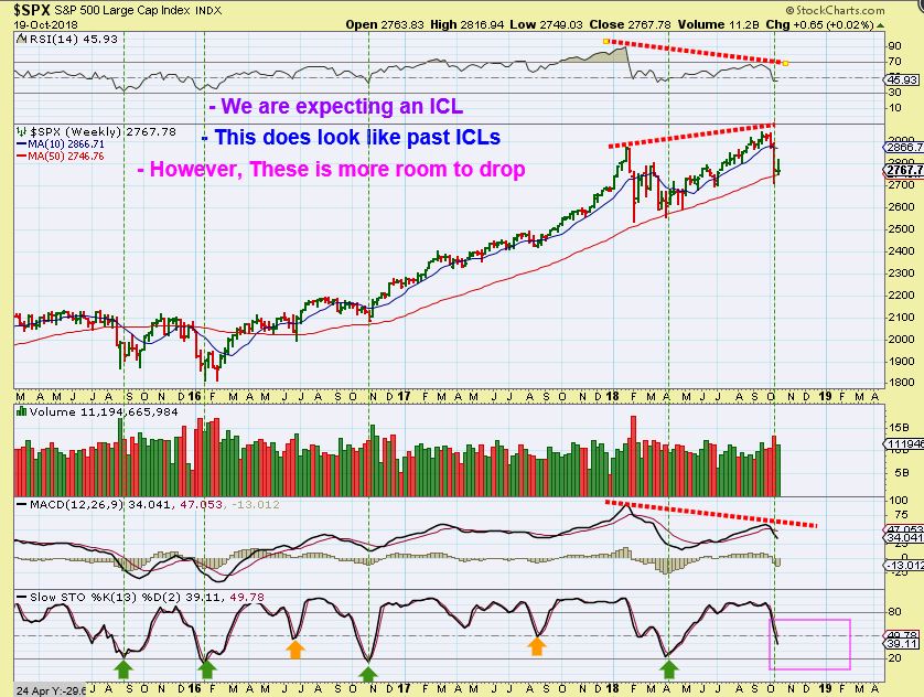 SPX – Please read the chart. We are actually late in the timing for an ICL, but this almost looks like we have more downside  (Stochastics).