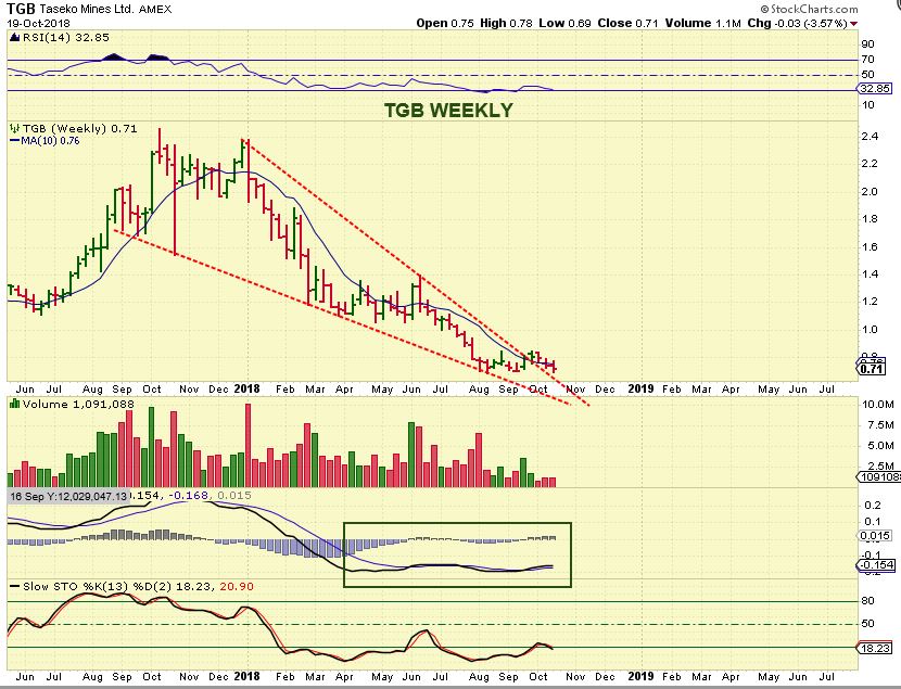 TGB WEEKLY –  We discussed TGB as possibly bottoming or basing out,  since we are seeing that in other metals stocks.   It is back at the lows, so I took a look at the weekly chart.  This could actually be a bullish descending wedge break out & back test.  Keep your eye on this one , if it starts moving higher, the lows could be in place.