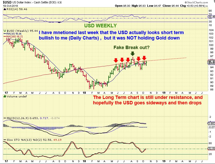 USD WEEKLY –   The weekly shows that the USD is still pinned under the 200 ma after a brief break out. This was a green week for the USD, but that did not hurt the Precious Metals. Please excuse the Typo on the chart, it is too late to fix it.  🙂  I have to say that this looks bullish at this point, so we’ll just have to see how things play out.