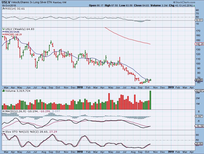 USLV –  I have been recommending owning a few Silver Miners, but some may also consider USLV ( a 3x Leveraged ETF), or even AGQ  (a double).  You may want to own these at the lows and use a stop, since  I do believe that we have the lows in place for Silver too.