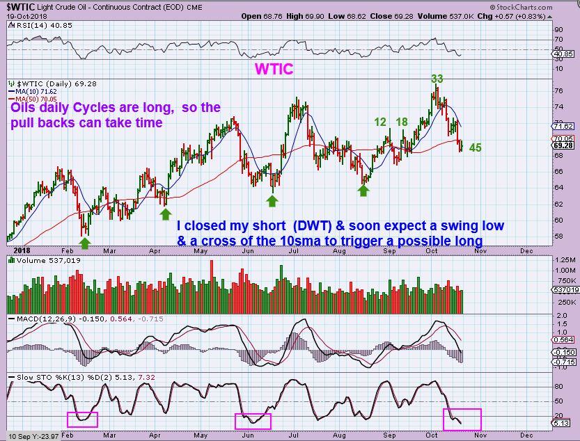 WTIC DAILY –  Oil is also now playing out as expected.  It is day 45, and Oils daily cycles can be 50+ days, but the way to view this is that it can bottom, form a swing low , and a dcl at anytime.   I had a ‘short position’ using DWT , but closed it already.   Prior drops below the 50 sma DID drop lower, so it isn’t time to go long yet, and this can drop to $67  (next chart).