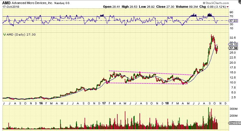 CSTM – The BIG Picture shows that we are at a point that usually acts as support, and if the sector warms up, this ought to run again. Eventually I would expect a break out higher and the run could be very good. Why? Well, Do you remember AMD…
