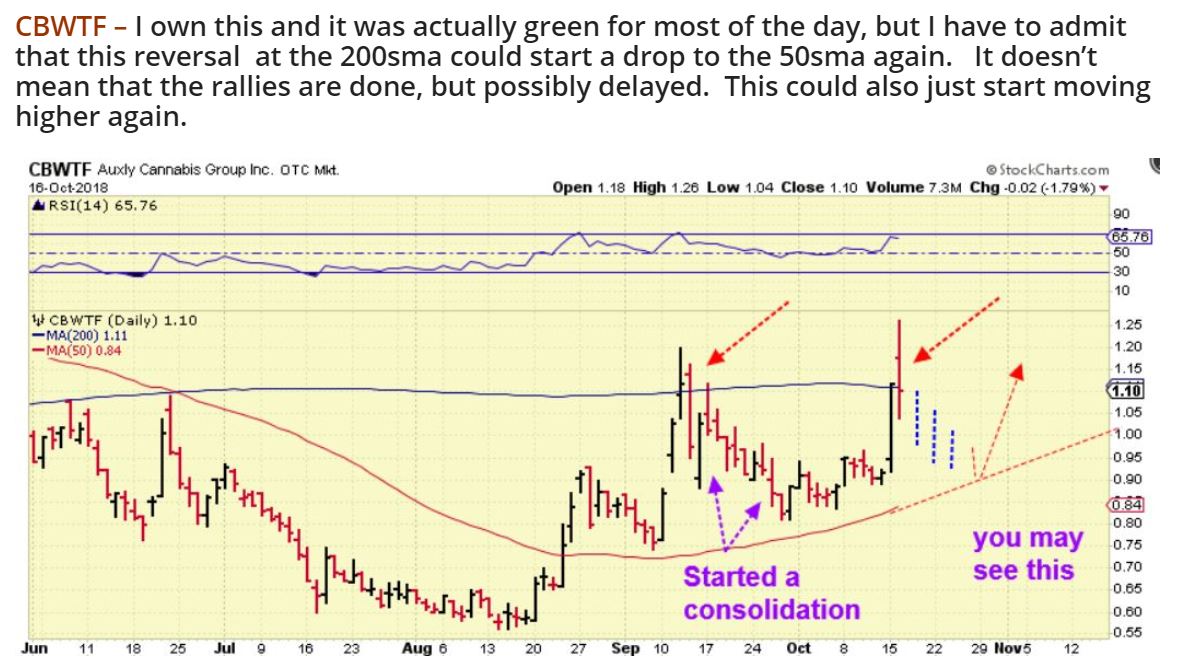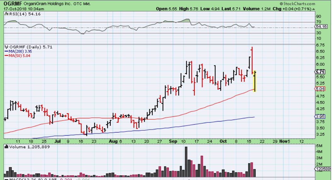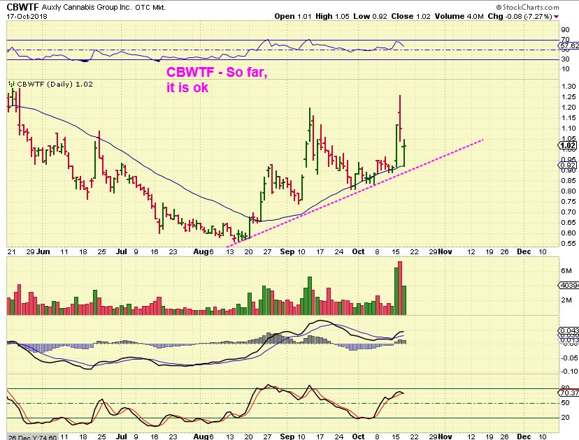 As you know, I’ve been watching many of the MJ stocks with the idea that they will be excellent growth companies, and they have been. Profits & Revenue are exploding. It should be noted though, that they also have already had a nice run heading into Canada’s Legalization day. The old saying goes , “Buy the rumor, sell the News”. In Canada , it is ” Buy the rumour, Sell the news , Eh?”, 🙂 and unfortunately, so far that is the short term reaction. Let’s take a look…