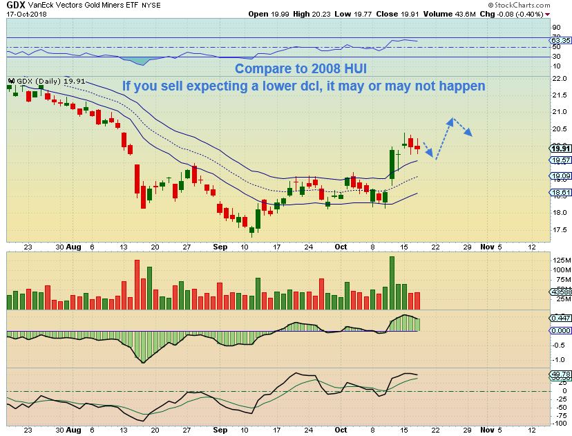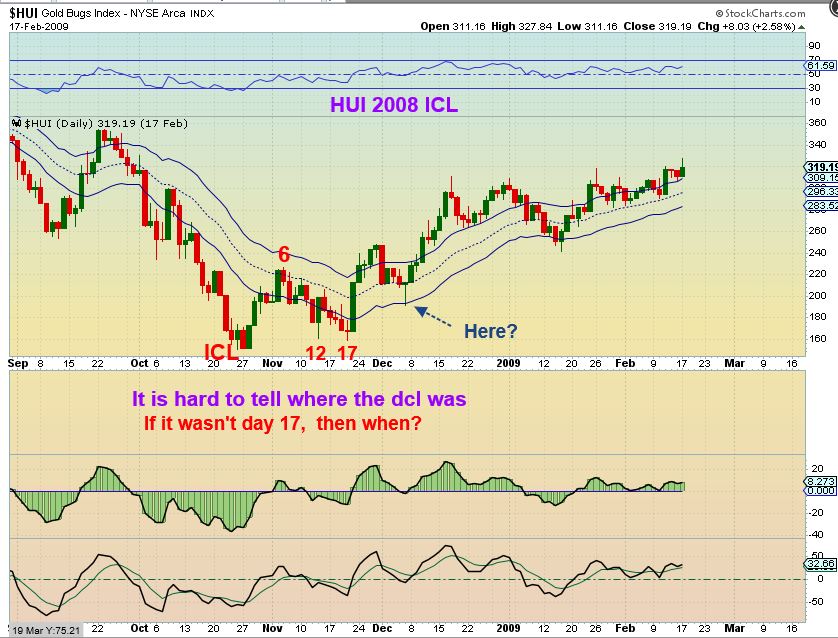 #1: THIS WAS HUI 2008 ICL. Was day 17 the DCL? If not, the next dip on day 26 was a dcl, but it came in a lot higher, it was a higher low. Was that higher low a day 26 DCL? Or was that day 10 of a new daily? Well, Our current GDX chart is very similar & tricky to read using cycles, but remains bullish too.