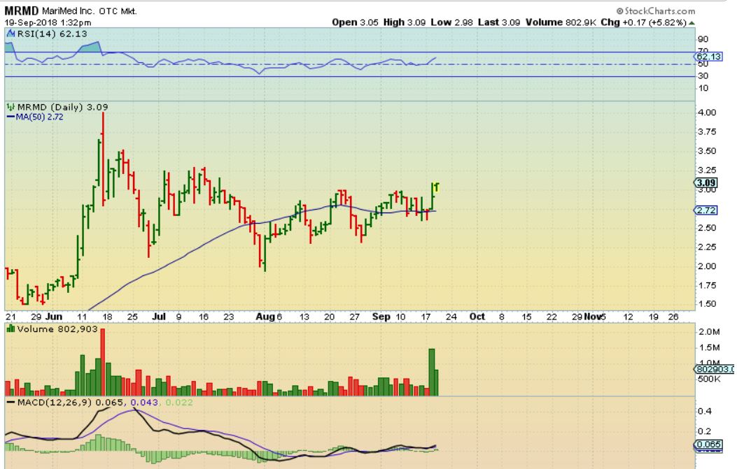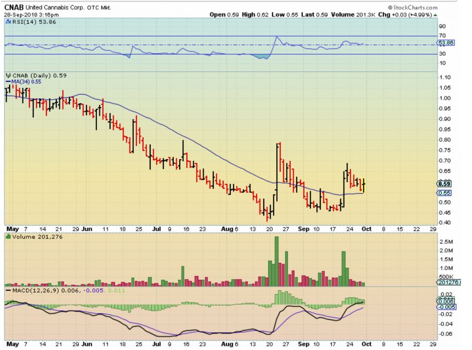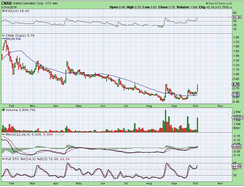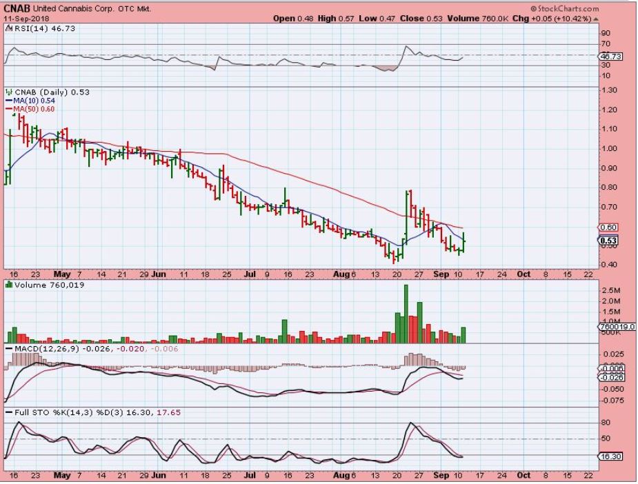 CNAB – Recommended Sept 11 near 50 cents. This is a double bottom low with divergence in a sector that was on fire. I bought CNAB.