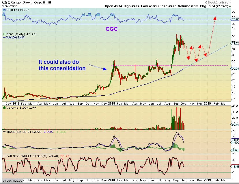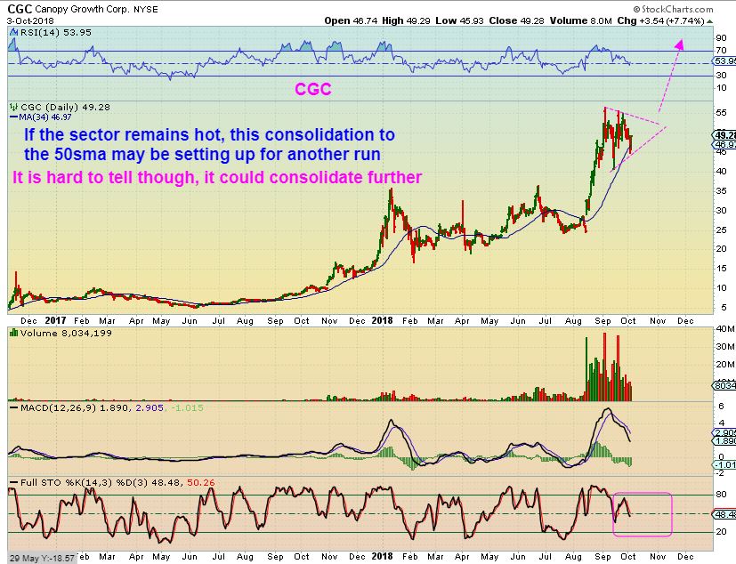 CGC – At times we see a much larger consolidation, so here I’ve drawn a possible long dragged out dip toward the 200sma. The stochastics is not oversold yet