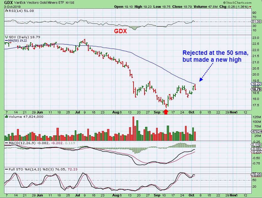 GDX – This rejection would be expected in Tech Analysis. It did make a new high Wednesday since the Sept lows.