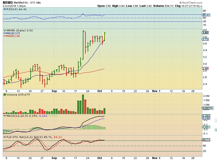 MRMD – It broke out after Noon Eastern time. It closed at $3.94. This could run higher immediately from this consolidation. It is STILL lower risk on the 10sma. That last ‘little run’ was $2.60 to $4.00. That gives this a possible $5 price target when it is ready to go.