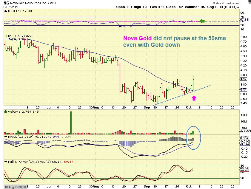 NG – Better yet, Look at NG on Wednesday. It bounced right off of the 50sma already with Gold down. Search through your list of Miners and look for health on a Gold pull back too. SBGL did well too.