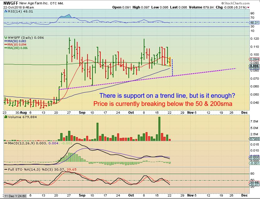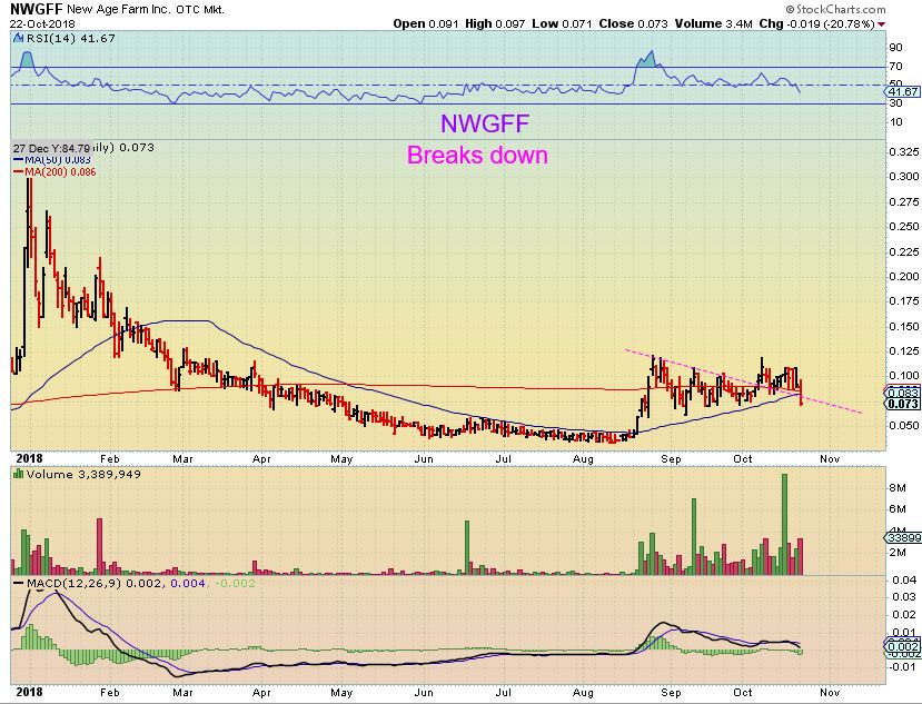 MJ – Canadas legalization was NOT the start of a bull run, it may have ended it. ‘Sell the news’. This now took the form of a double top, with less energy on the second run higher. Right through last week it looked fine. Last Tuesday it was at the highs, but a reversal took hold. Almost all of the MJ stocks acted fine last week, and suddenly the drop that says ‘game over’. Even 2 days ago, you can see that this was fine and above the 10sma, but out of no where, support breaks and it often signals that a consolidation is coming. I am almost completely out of the sector ( I own NWGFF) , but will watch the consolidation phase and re-enter when the time is right. That could be months from now. Lets discuss this a bit more… .