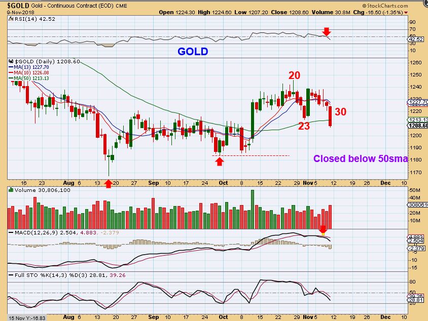 GOLD – This could be 2 daily cycles and the break below the 50 sma is a drop into a dcl at day 30. That was a big drop Friday, but…