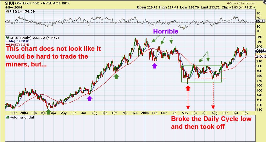 GREEN BOX – I pointed out the 2004 chop in Miners, where in July price plunged below the 50 sma & even the first DCL, and then recovered. Can Gold do that now? it can, but that isn’t normal cycle action, so I wont look for that – but this just shows that this drop in Gold at day 30 can stop & turn higher too.