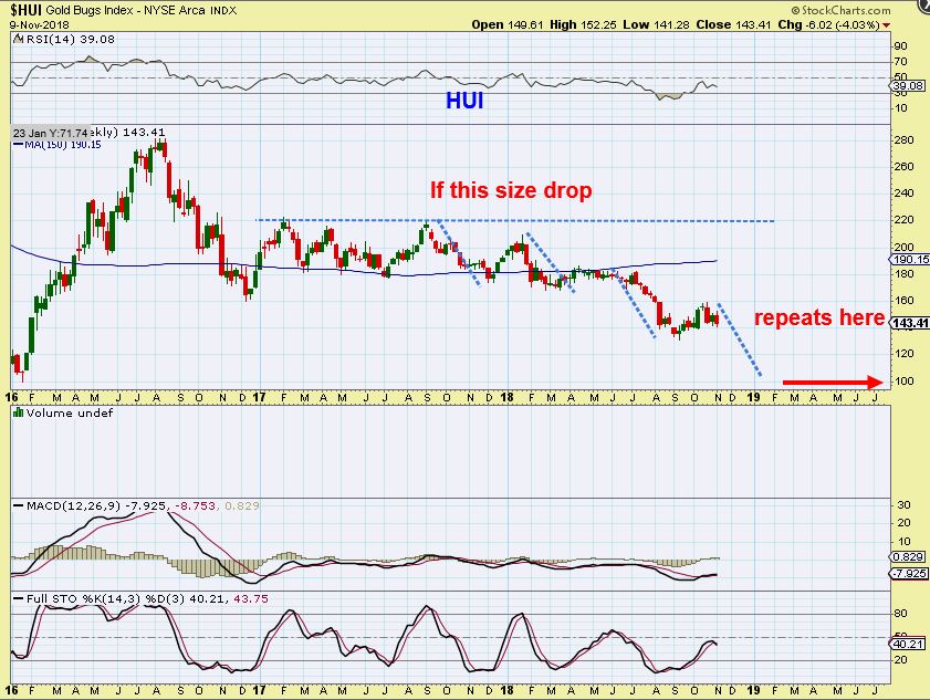 AS FOR MINERS? IT IS POSSIBLE THAT THEY MAY RESIST SOME OF THE SELLING AND RUN SIDEWAYS / CONSOLIDATE AS SHOWN IN THE OTHER CHARTS SIMILAR TO 2015, AND BUILD BASES. SMARTER MONEY MAY BEGIN OR KEEP ACCUMULATING AS GOLD SELLS DOWN. IF NOT, LET’s REVIEW A MINERS DROP LIKE THAT…