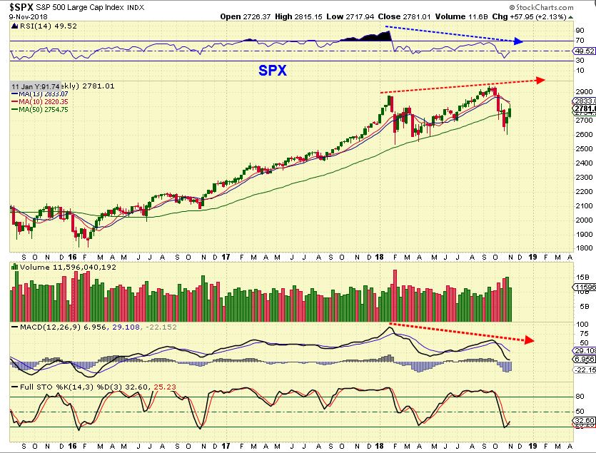 SPX WEEKLY – price was rejected at the 10 weekly ma. That was strong divergence at the double top, and this honestly could be a double top where 2019 is just choppy or drops and cannot rally to new highs. There are cracks appearing in the bull market.