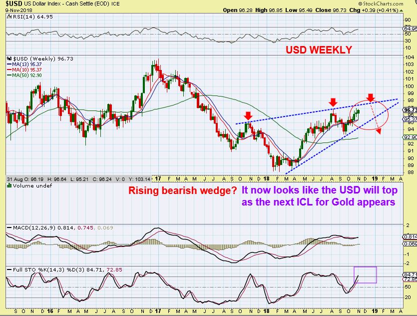 USD – I am watching this big picture pattern form as a bearish rising wedge. This has a little more time to play out, but would be bigger picture bearish. Could this top near Golds next ICL?
