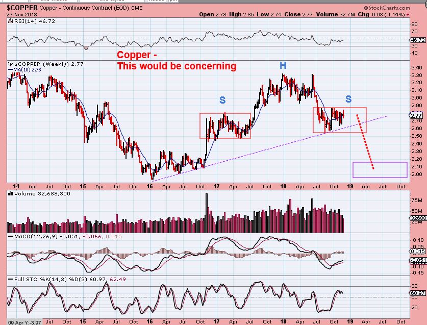 COPPER #1 –  Copper is at a long term uptrend similar to what Oil just crashed through. I would have expected ‘inflation’ to continue pushing up the commodities, but when Oil crashed down  (and Gold dropped rapidly this summer too), I wanted to look at this chart of Copper.   THIS WOULD BE  BULLISH. A consolidation similar to 2017, but…