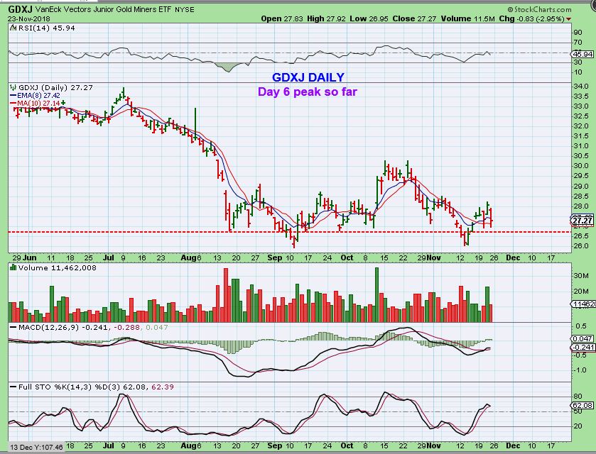 GDX #2 – This is GDX as of Friday. It dropped to the 8 ema/ 10 sma area and it is in a mid point resistance area.  SO FAR this is a day 6 peak.