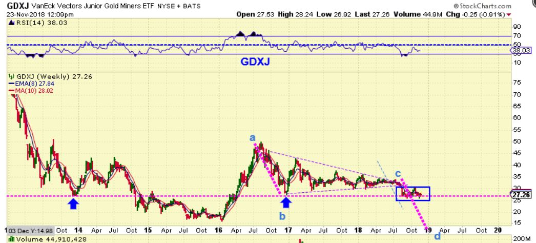 GDXJ – The dreaded a-b = c-d   ( Again,  the current COT does not seem to support this idea, but it has to be presented as a cautionary note).  ‘c’ can also be taken from the highest bounce off of ‘b’, so the blue line has been added.
