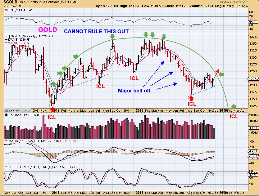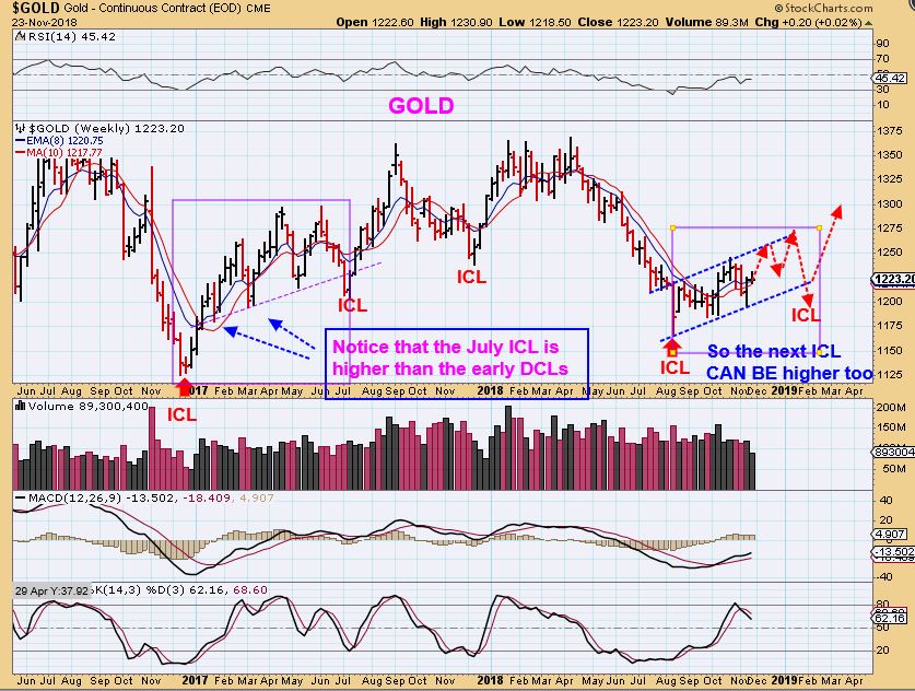 GOLD WEEKLY #2  – A MORE BULLISH SCENARIO.  If the USD is going to roll over-  The next ICL  does not have to be lower than our current ICL,  read the chart. At times in the past it didn’t even break the first dcl.  Read the chart.