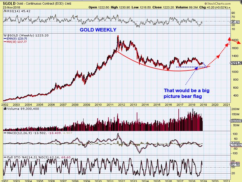 GOLD WEEKLY#4  – A bearish short term view could be this weekly dome. Read the chart. How would that drop look in the Real Big Picture?