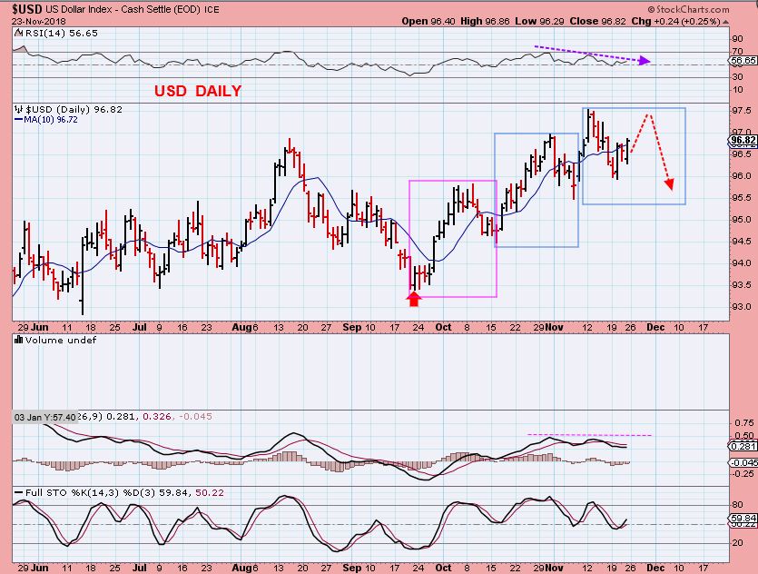 USD  DAILY – If the 3rd daily cycle for the USD is going to be ‘the peak’, it could roll over shortly.  The RSI looks to be weakeningI will discuss another interesting side note later in the report.