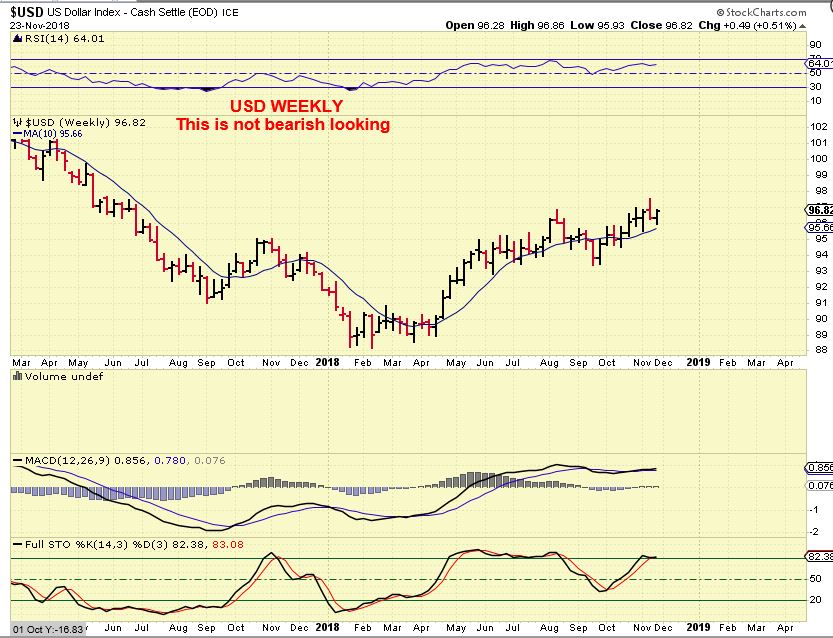 USD WEEKLY – The weekly chart for the USD does not look weak, it is above the 10 ma.  This actually looks strong…The good news? This recent strength from September has not hurt Gold recently, but it has not helped either.