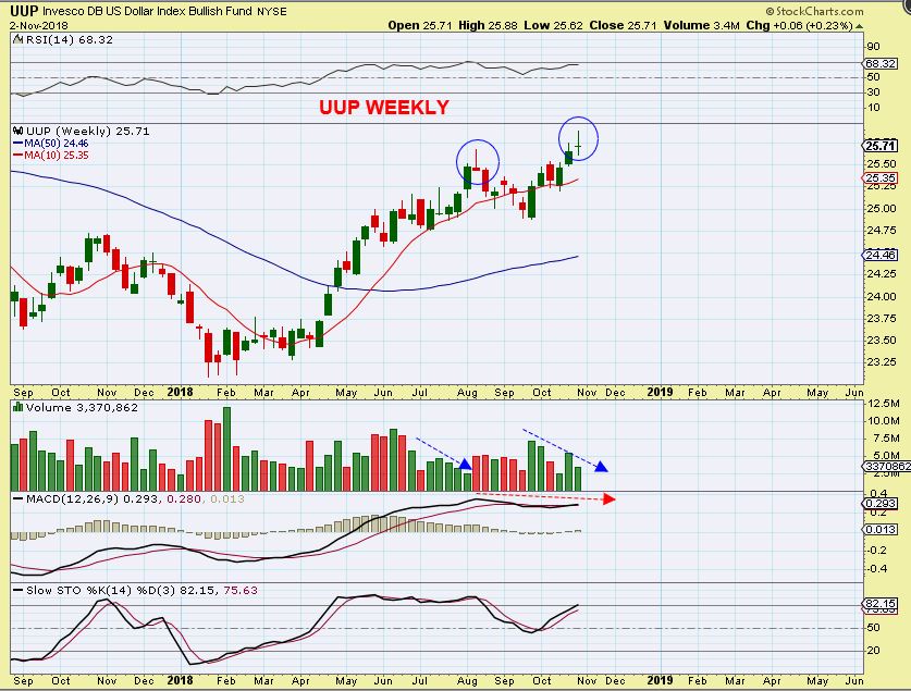 UUP WEEKLY, used for Volume – The weekly has a Doji Top. This should be the top for now, and I expect the USD to drop and Gold to rally.