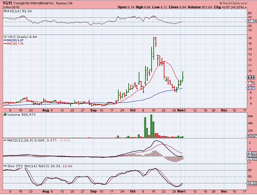 YGYI DAILY – I posted this as I bought it at the 50sma. It is really a normal pull back, but a drop from $16 to $6 is severe if you rode that down. So I grabbed this one…