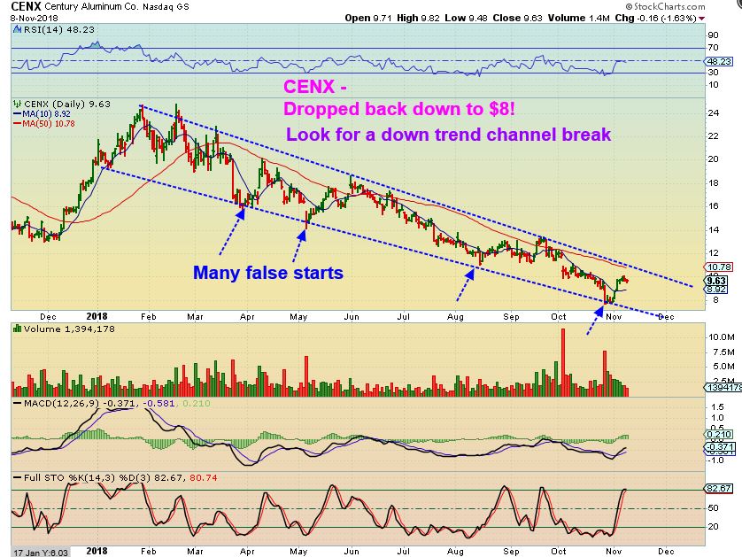 Aluminum Stocks like AA and CENX have been selling off all year long, after a rally into the end of last year. If Cenx can break above the down trending channel, it may start to trend higher or base out too ( This is NOT ready to buy, but it had a strong POP in November too).