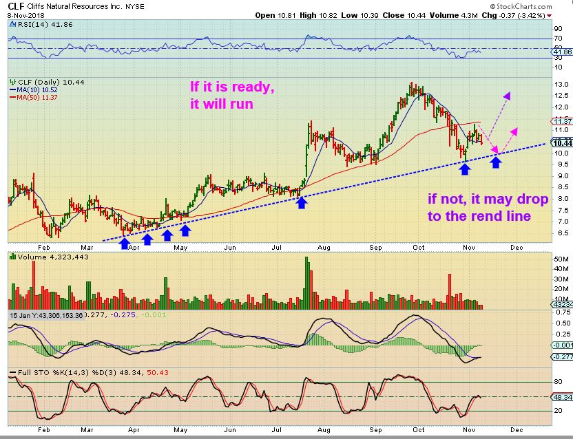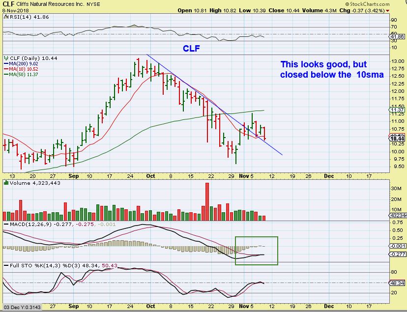 CLF – CLF broke its short term down trend and is back testing that trend line, but closed below the 10sma. It could ride down the trend line to $10. Why do I say that?