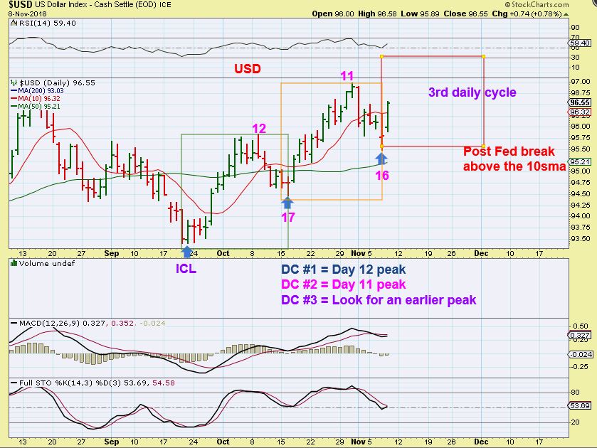 USD – This looks like a DCL after the FOMC Meeting. The Good news is that THIS pop in the USD happened and GDX closed Green. This may Peak by day 8 or so, and be a Left Translated daily Cycle. The 4th & 5th daily cycle would be rolling over lower into an ICL, but so far, the USD is bullish and has been bullish – but it has not caused a Gold Sell off.