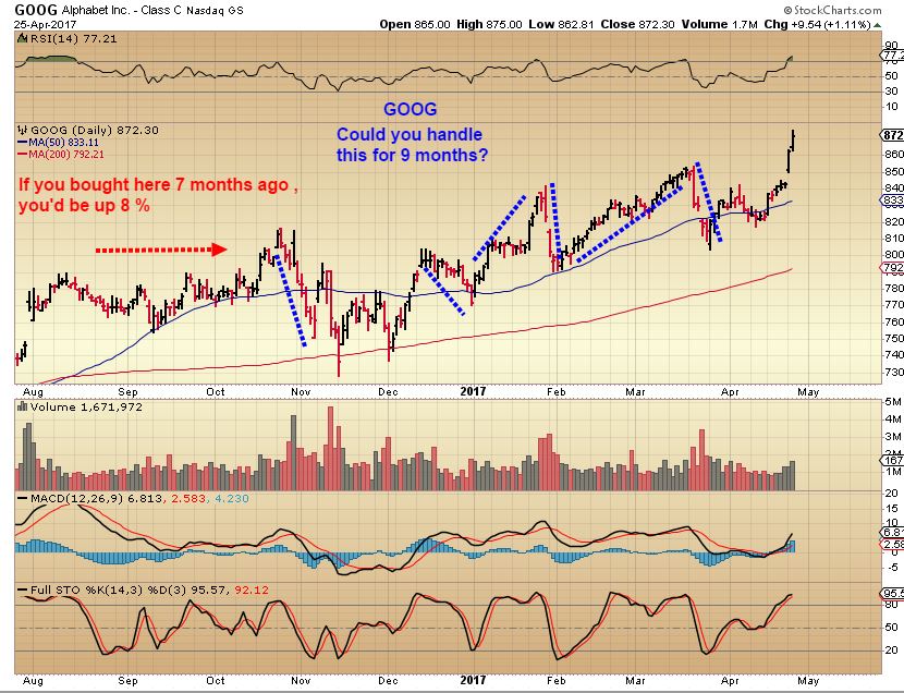 GOOG –  Goog ran from here in this 2017 chart to $1250.  Does this 9 month price action look like a nice easy ride to you?  I see many Miners that look better than this.   So many say, ” I wish I just bought GOOG and held it“, and I say, “Could you have held on to this?” Picture buying this and look at each day after day after day.   Especially NOT EASY if most of the news at this time is bearish sounding & people throwing out Google conspiracy theories 🙂