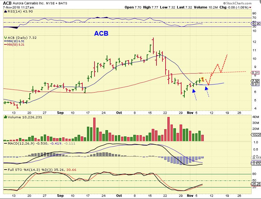 ACB – Recently  I pointed  that this sector was heating up a again, and  I posted this chart and mentioned  in the comments that I was adding to my ACB  position (this used to be ACBFF) above the 10sma.