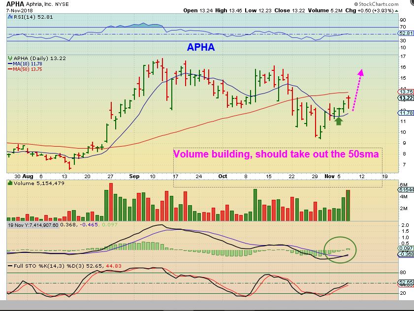 APHA DAILY – This was APHQF, and I repurchased this one too, since it regained the 10sma and volume is also swelling.  This shows buying interest and the ability to take out the 50sma if that buying continues.   This 2 month consolidation may now be over.