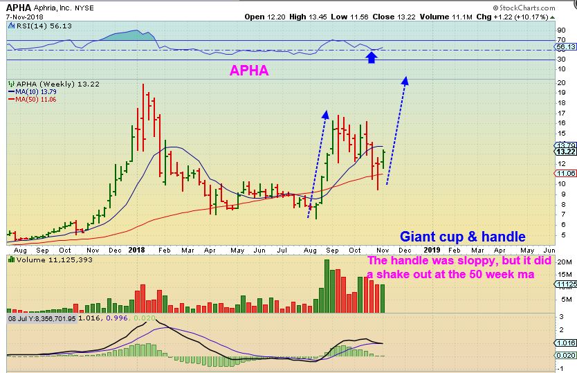 APHA WEEKLY –  The weekly  APHA Chart shows that the recent sell off & consolidation may be a sloppy handle on a much bigger cup & handle.  If so, and if this sector remains hot, the upside is very promising.