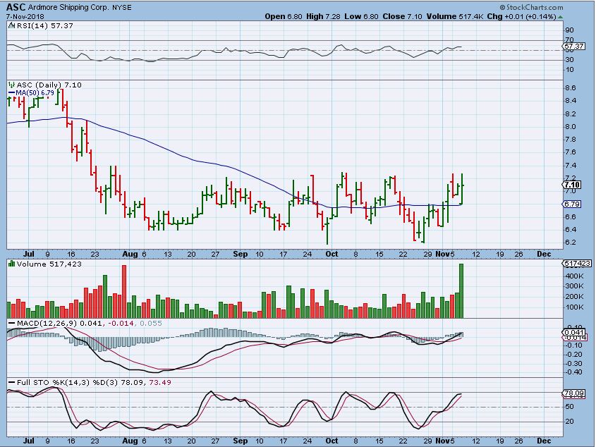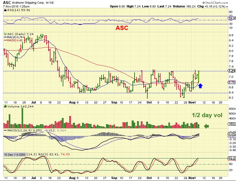 ASC –  Look at the volume at the end of the day.  I decided to take a position.  They released earnings yesterday and conference called at 10:30, this may be ready to break out.