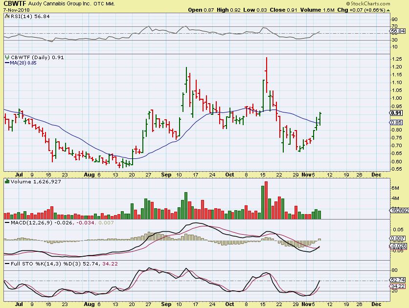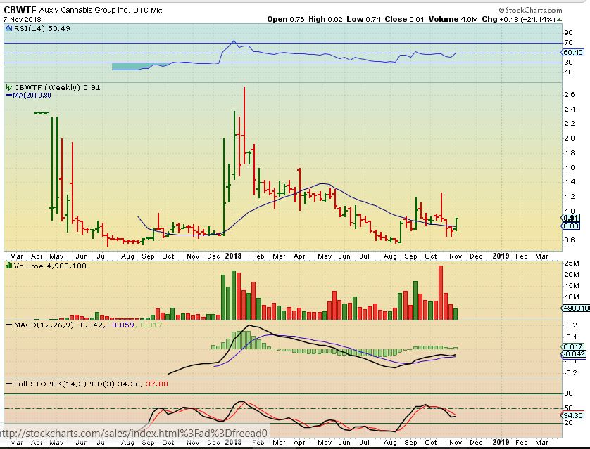 CBWTF WEEKLY – The weekly MACD is bullish, and a stock like this is already up 24% for the week, but they all could have more upside if this sector continues to act bullishly.