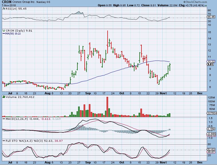 CRON – Another  ‘listed’ stock , it is running to the 50sma and volume is increasing, so I think that this can break higher too. Look how fast these go, from $6.50 to $10 in days.
