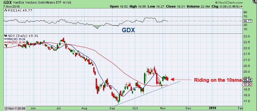 GDX –  We have an uptrend and GDX remains ( for now) above the 50sma.  GDX ran,  from the September lows to the October highs, 18% so far.  I warned readers even before the drop started,  that GDX could back test the 50sma.    Now it has done that, and then it bounced.  And now…