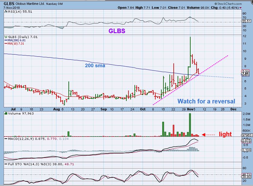 GLBS –   It’s almost at the 200 sma, but I wouldn’t buy until I see a good reversal. We could see a ‘shake out’ or break down, but so far it has been a light volume drift lower.
