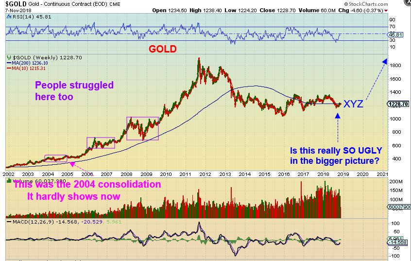 THIS IS A VERY BULLISH CHART TO MY EYES. Look at where we are now on this chart.  Scary? bearish?  painful?  If so, then you must have missed the 2004, 2007, 2008, 2012  chop, because this is Normal Bull Market action to me and 2008 was scary. The drop in 2012 was bad & bearish.  This chart looks constructive,  based on what we know about bases, right?  It is always a matter of ‘time’ .