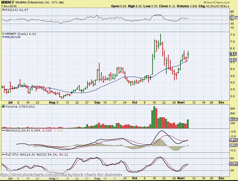MMNFF–  I forgot to change from 20sma to 50sma, but this is a bullish MJ STock that makes good revenue too.