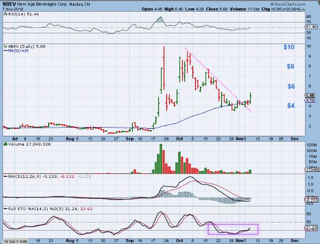 NBEV – You may recall this Beverage Company that ran from under $2 to $10 in days.  It has been consolidating at the 50sma and broke higher yesterday. it could be considered a semi- Low risk entry? Well,  a stop under the 50sma and trail it up,  this moves big.