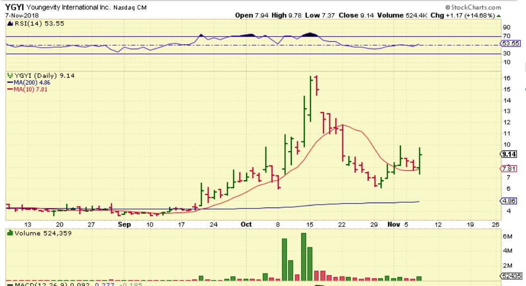 YGYI –  It ran from $6 to $10 in 3 days!!  Then it pulled back to the 50sma and reversed yesterday.   This is a buy here,  but be ready for a crazy ride.  I have traded this ( I am in it).  In fact, this chart was at 3:20  p.m. and…