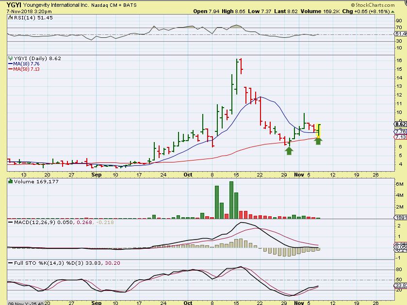 YGYI –  Very Bullish, but not for the low risk trader.   I pointed out this one on Nov 1st at the 50sma. It is Bullish,  but can be a very tough one to ride.  It moves $1 or even $2 in a single day,  in either direction.