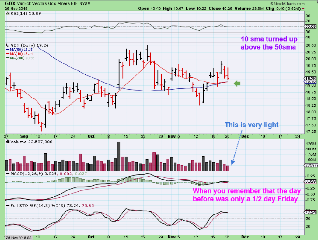 GDX – GDX dropped down toward the 50sma. As you can see, GDX has been sideways or choppy for quite a while. Read the chart, GDX had very light volume, even less than a 1/2 day Friday.