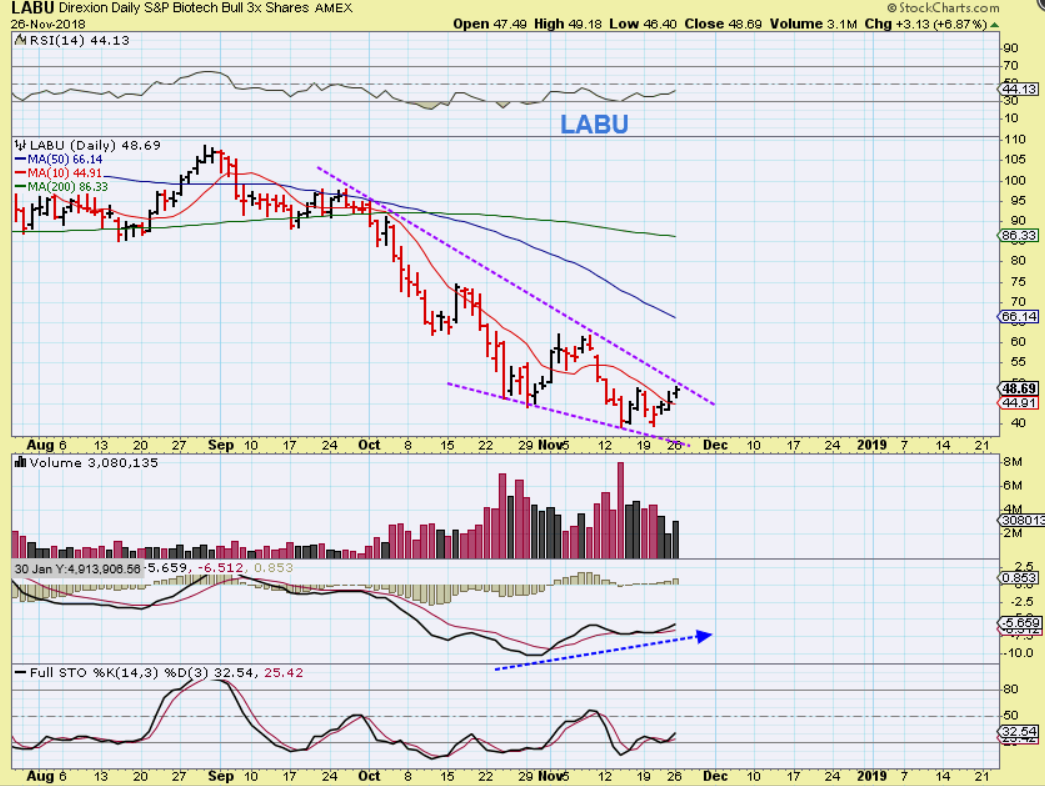 LABU – I actually like this wedge in the LABU. This could break and run to the upper moving averages too, but again, the trading has been choppy & difficult. I do like the solid divergence in the MACD on that final low.